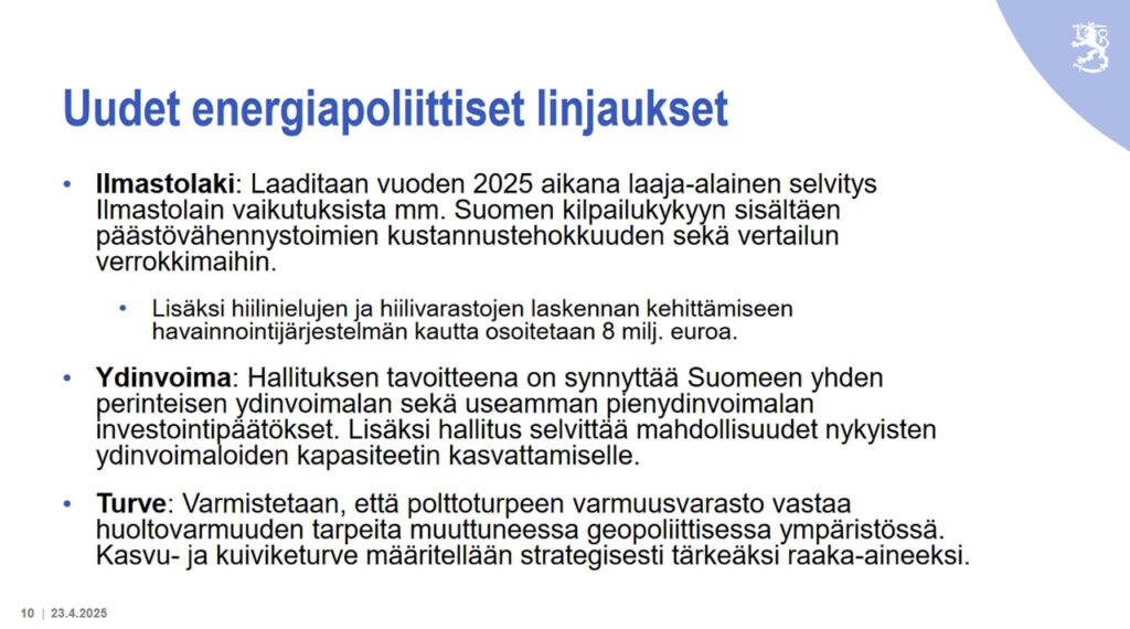 Valtioneuvosto. 2025. Uudet energiapoliittiset linjaukset. Valtioneuvoston kehysriihen tiedotustilaisuus. 23.4.2025. Viitattu 24.4.2025. Saatavissa https://valtioneuvosto.fi/documents/194055633/200124281/Valtiovarainministeri+Purran+esitysmateriaali+hallituksen+puoliv%C3%A4liriihen+tiedotustilaisuudessa.pdf/c90d2ccc-ae71-eedc-7070-569d18d6ecd0/Valtiovarainministeri+Purran+esitysmateriaali+hallituksen+puoliv%C3%A4liriihen+tiedotustilaisuudessa.pdf?t=1745432603283
