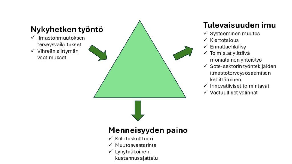 Työskentely vahvisti opiskelijoiden tulevaisuuslukutaitoa: kykyä hahmottaa epävarmuutta, tunnistaa muutosajureita ja rakentaa toivottavia tulevaisuuksia. Menneisyyden paino näkyy esimerkiksi kulutuskulttuurissa ja muutosvastarinnassa, nykyhetkeä ohjaavat ilmastonmuutoksen terveysvaikutukset ja vihreän siirtymän vaatimukset, ja tulevaisuuden imu kutsuu kohti ennakoivaa ja kestävää sote‑järjestelmää. Monialainen yhteistyö, ilmastoterveysosaamisen vahvistaminen ja uudet toimintatavat voivat tehdä sote‑alasta suunnannäyttäjän kestävän hyvinvoinnin rakentamisessa.